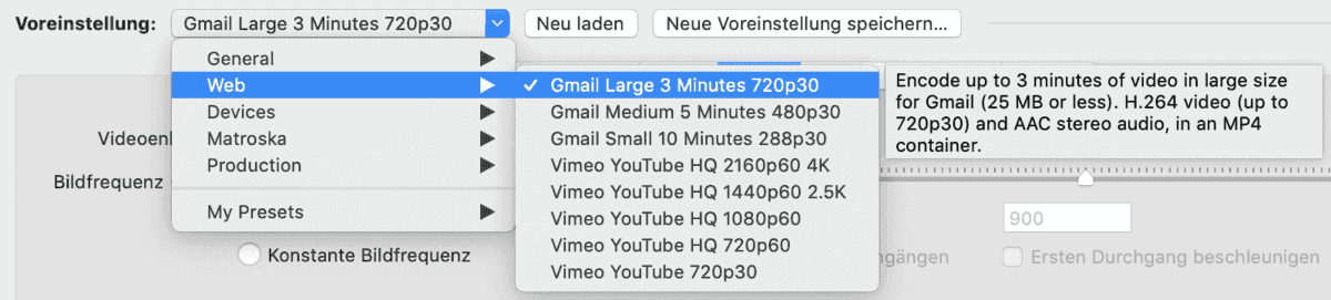 - Mit der Voreinstellung Web/Gmail Large 720p encodieren: